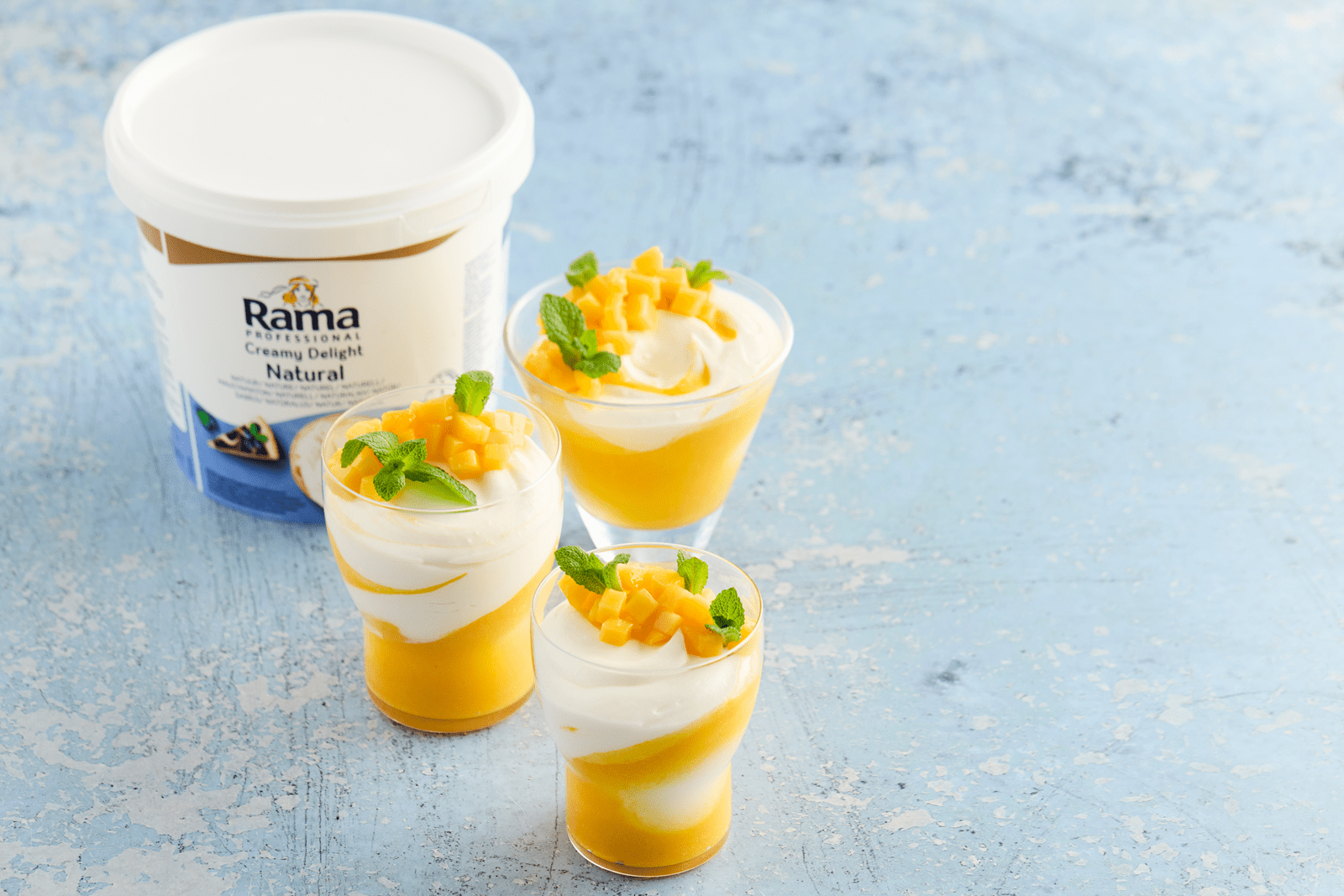 Ce dessert mangue‑fruit de la passion en verrine associe une mousse Rama légère et stable à un curd mangue‑passion frais, offrant un équilibre parfait entre douceur et acidité. Grâce à l’utilisation de Rama Natuur et de Solo Liaison et foisonnement 31 %, ce dessert garantit une structure fiable, une mise en œuvre fluide et une excellente tenue en mise‑en‑place. Le montage en spirale assure une présentation élégante, rapide et facile à dresser en service. Idéal pour les chefs professionnels à la recherche d’un dessert moderne, régulier en qualité et laissant place à une finition créative.