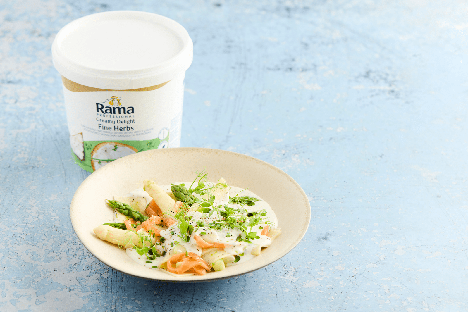 Cette recette raffinée de pâtes aux plaques de lasagne, asperges vertes et blanches et saumon fumé séduit par sa fraîcheur et sa présentation élégante. La sauce onctueuse à base de Rama Fines Herbes et de l'alternative à la crème culinaire Flora 15 % offre une saveur délicate, une excellente liaison et une texture homogène. Idéal pour les cuisines professionnelles recherchant efficacité, régularité et goût, ce plat saisonnier apporte une touche premium aux menus de restaurants et bistrots.